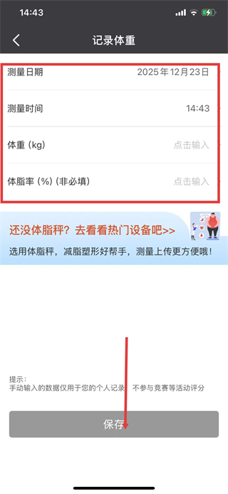 3、在记录体重页面,输入体重,确认日期和时间后,点击保存。