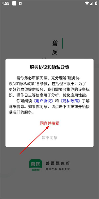1、在使用协议隐私政策弹窗中点击同意并接受,进入登录页面。