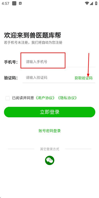 2、在手机登录页面填写手机号,勾选协议后,点击获取验证码。