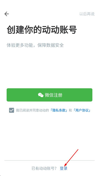 2、在创建动动账号页,点击登录的选项,进入登录页面。