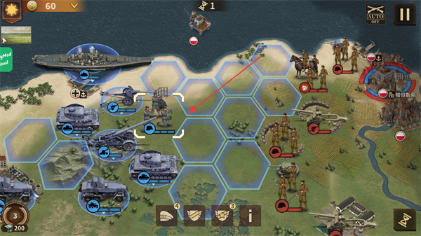 2、在六边形战场中,操控己方部队如坦克向敌方区域移动,推进战线。