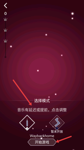 2、进入游戏后,若音乐有延迟或提前的情况,可点击相应按钮进行调整,以获得更好的游戏体验,调整好后,点击开始游戏按钮,正式进入游戏。