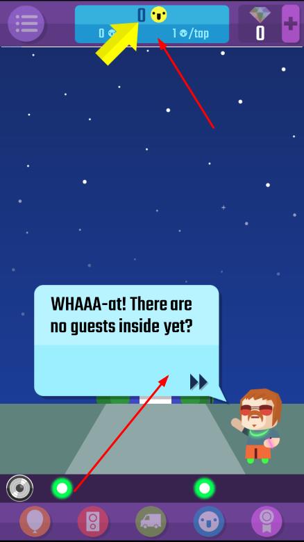 1、进入界面,会看到屏幕上方显示笑脸图标计分,以及每秒钟获得的分数和单次点击获得的分数,点击屏幕继续。