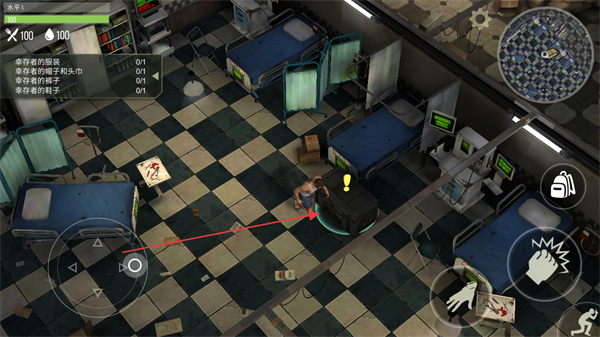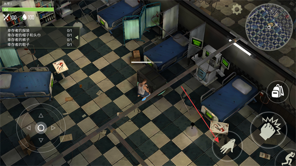 1、操控角色在场景内移动,收集任务要求的物资如布条、鞋子等。