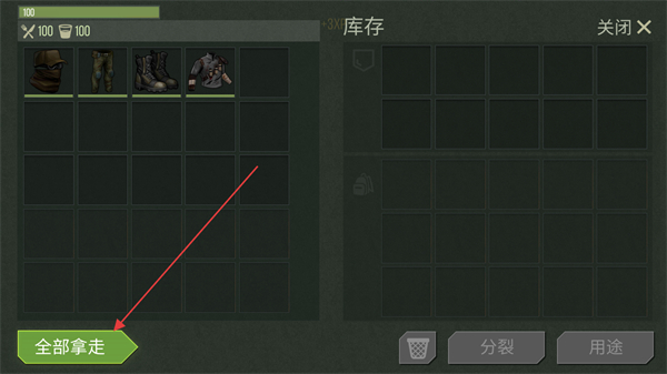 4、打开库存界面,点击全部拿走收纳收集到的物资,推进游戏进度。
