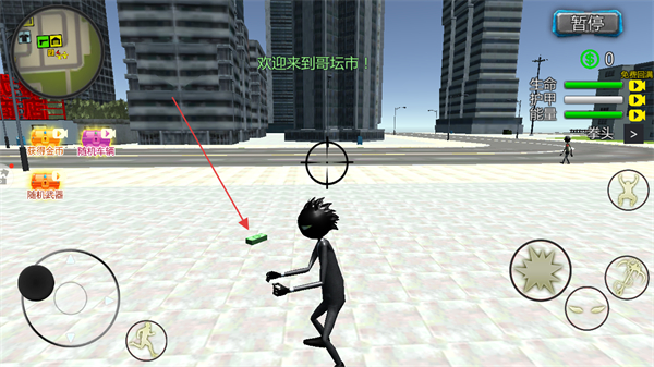 1、操控移动键靠近绿色道具,拾取道具获取资源,在哥坛市场景中推进流程。