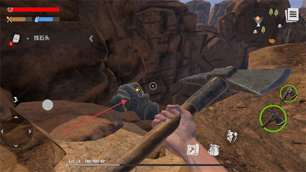 2、根据提示找石头,用镐子开采场景中的石头,获取石材资源。