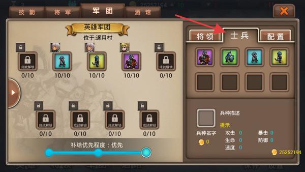 3、切换到“军团”界面,点击【将领】标签,配置出战将领与士兵。