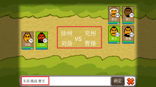 2、遭遇战斗时,根据敌方将领属性和我方将领情况,选择合适将领出战(如关羽挑战曹丕),点击“确定”进入战斗。