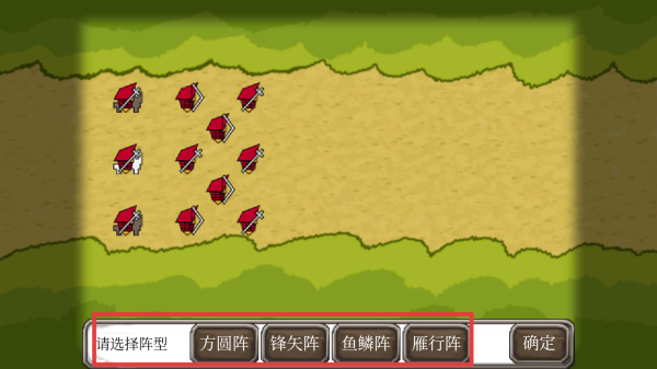 3、战斗前选择阵型,不同阵型有不同效果。根据敌我兵力和将领特点选择,如锋矢阵利于进攻,鱼鳞阵侧重防御。选好后点击“确定”。