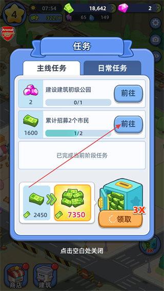 1、在任务界面点击前往,推进累计招募2个市民主线任务,当前进度1/2。