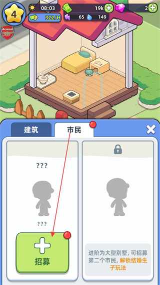 2、进入市民界面,点击招募按钮,解锁第二个市民的招募权限。