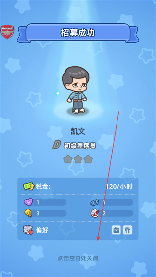 3、招募成功获得市民凯文,显示其身份为初级程序员及属性,点击空白处关闭界面。