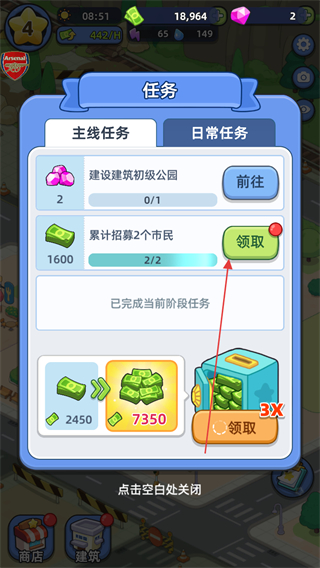 4、返回任务界面,点击领取按钮,完成累计招募2个市民任务并获取奖励。