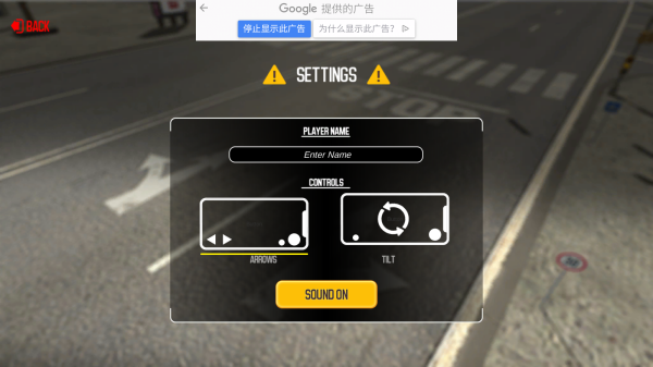 1、进入设置界面,在【PLAYERNAME】输入框中输入玩家名字,选择【CONTROLS】中的【DRIVING】或【TILT】操控方式,点击【SOUNDON】开启声音,完成设置后开始游戏。
