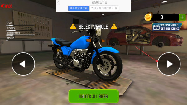 3、进入车辆选择界面,挑选心仪的摩托车,点击右侧播放按钮查看车辆详情,也可点击【UNLOCKALLBIKES】解锁更多车辆。