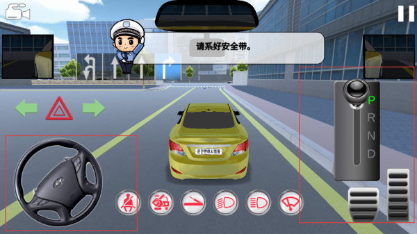 3、进入驾驶场景后,根据屏幕提示【请系好安全带。】,通过左下角方向盘控制车辆转向,右下角换挡杆切换挡位,配合使用其他功能按钮,进行驾驶操作。
