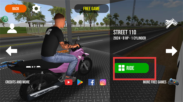 1、选择好摩托后,点击绿色【RIDE】按钮,即可进入游戏开始摩托驾驶闯关。
