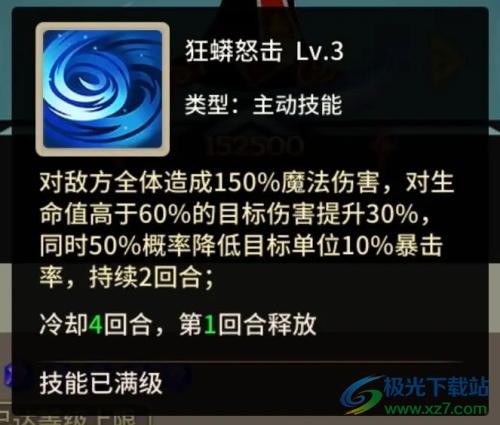 对敌方全体造成150%魔法伤害,对生命值高于60%的目标伤害提升30%同时50%概率降低目标单位10%暴击率,持续2回合。