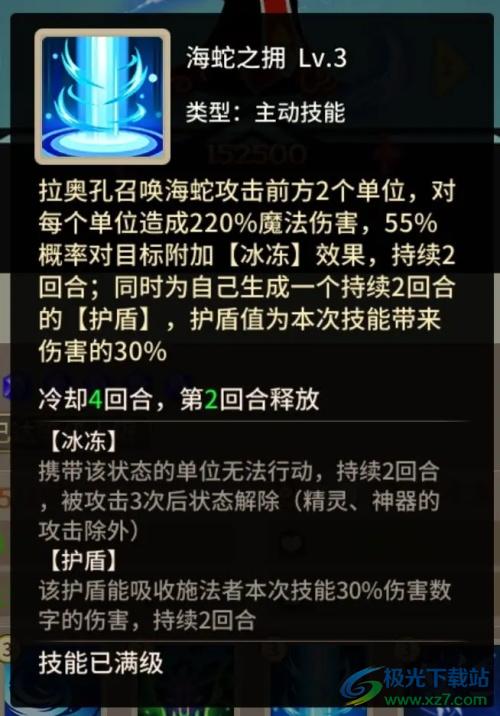 拉奥孔召唤海蛇攻击前方2个单位,对每个单位造成220%魔法伤害,55%概率对目标附加【冰冻】效果,持续2回合;同时为自己生成一个持续2回合的【护盾】,护盾值为本次技能带来伤害的30%。