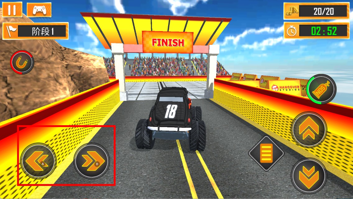 1、基础驾驶操作:左键控制方向,右键控制加速与刹车,还需把握时机按下特技按键完成空中动作。