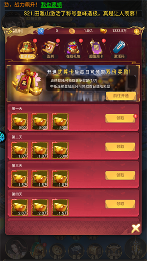 4、武尊卡福利,每日登录都可以领取大量金元宝作为奖励。