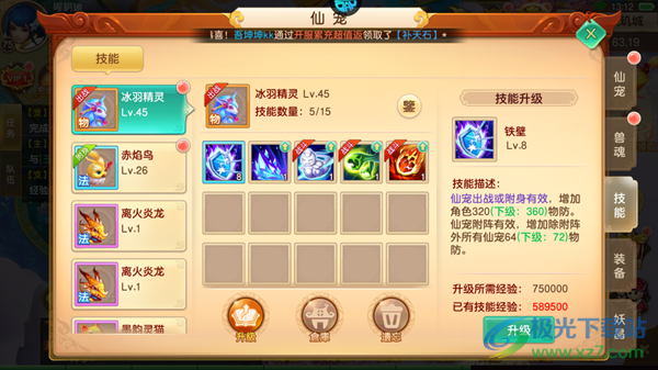 1、冰羽精灵:铁壁,增加角色320物防。仙宠附阵有效,增加除附阵外所有仙宠64物防,所有数值均可以随着技能等级提高而提高。