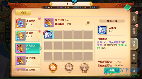 3、离火炎龙:云体术,仙宠出战、闯关和仙宠竞技有效,增加仙宠300闪避,数值均可以随着技能等级提高而提高。
