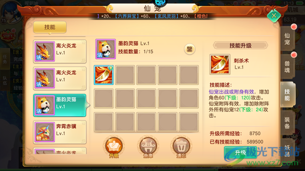 4、墨韵灵猫:刺杀术,增加角色60攻击。仙宠附阵有效,增加除附阵外所有仙宠12攻击,数值均可以随着技能等级提高而提高。