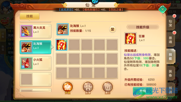 5、叱海猴:狂暴,增加角色50暴击。仙宠附阵有效,增加除附阵外所有仙宠10暴击,所有数值均可以随着技能等级提高而提高。