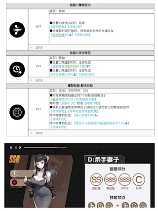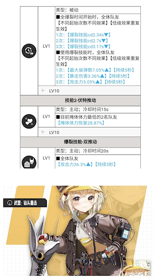 前期可能感觉减冷却不大好用,不过后期就好了。因为像丽塔冷却需要叠层,在前几次爆裂的时,可能卡冷却。而她不需要叠层,如果充能不是非常快的话,基本上每次爆裂都是无缝的。当然这个角色想吃满她的buff的,还需要有一个带穿透属性的,狙击枪队友。