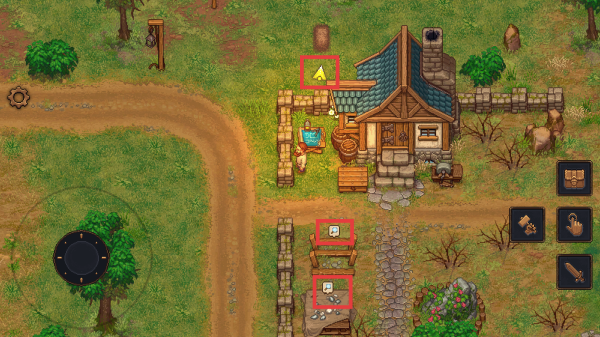 3、探索房屋周边区域,留意红框内有提示标志(如黄色叹号、纸张图标)的地方,获取线索或道具。