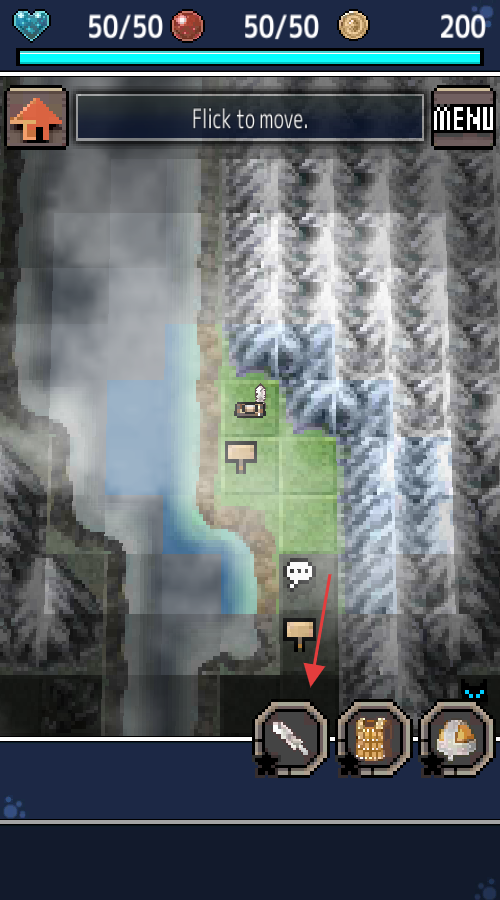 2、在地图界面,下方有武器等图标(箭头指向),点击可查看武器列表等,按【Flick-to-move】提示移动角色。