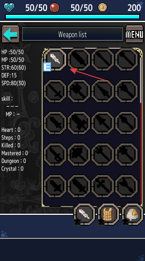 3、进入【Weapon-list】界面,选择箭头指向的武器(带【E】标识),装备以提升角色战斗力,继续探索游戏。