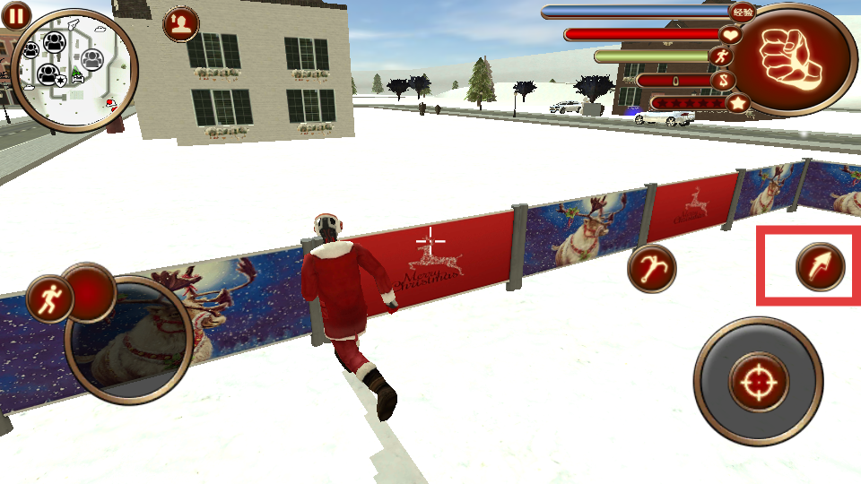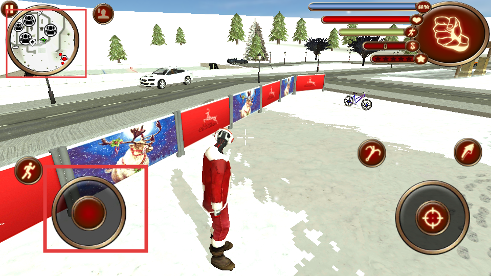 1、利用左上角的地图查看场景布局和目标位置,左侧的虚拟摇杆控制角色移动,在雪地场景中探索不同区域,完成任务目标。