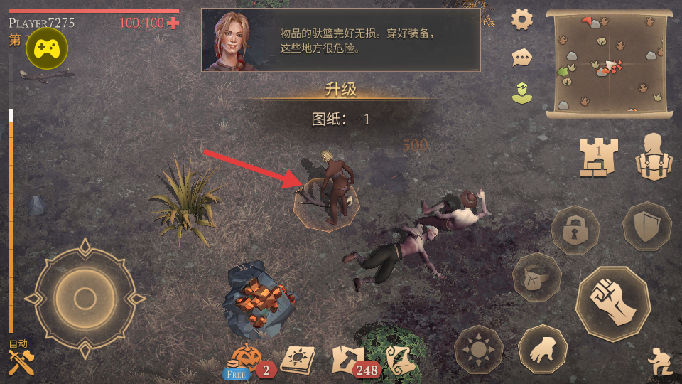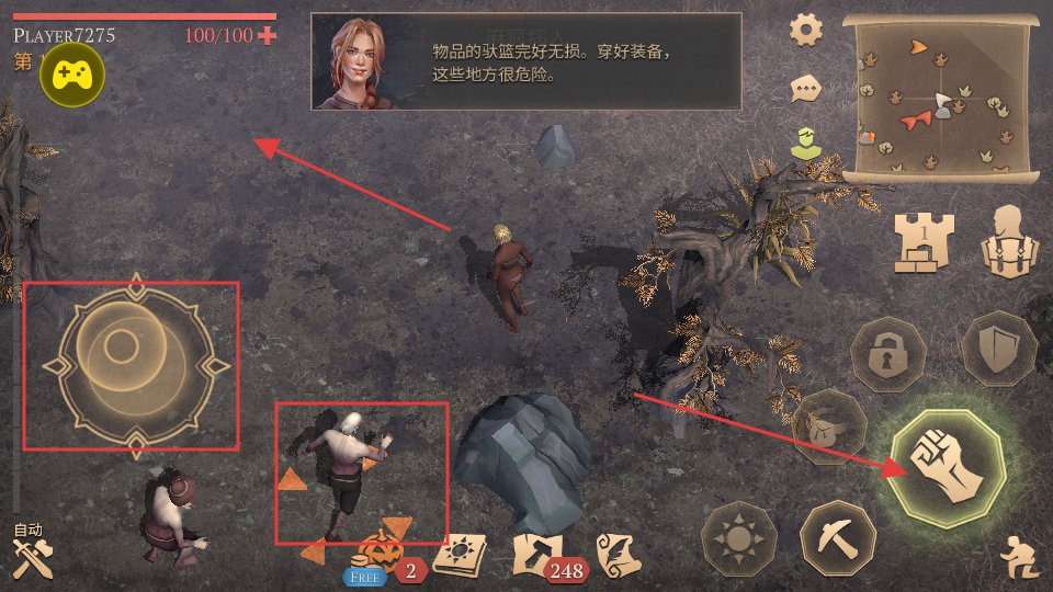 3、通过左侧虚拟摇杆控制角色移动,右侧拳头按钮进行攻击,在场景中探索资源、击败敌人,同时关注上方提示,穿好装备提升防御。