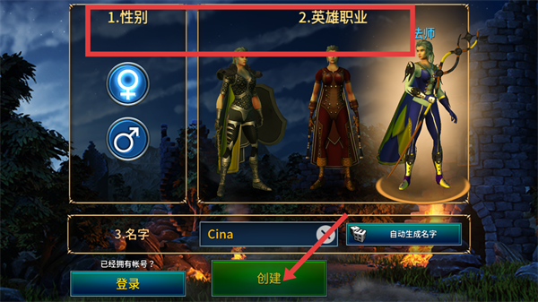 2、角色创建时,先选性别、英雄职业,设置名字后点击【创建】,即可生成专属角色开启征程。