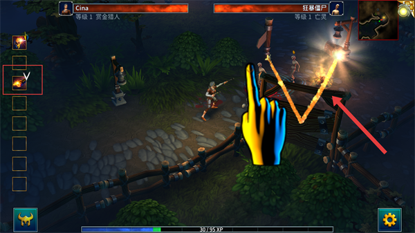 4、战斗中可点击左侧技能栏技能,或按提示滑动施法,配合移动击败【狂暴僵尸】等敌人,快速提升等级。
