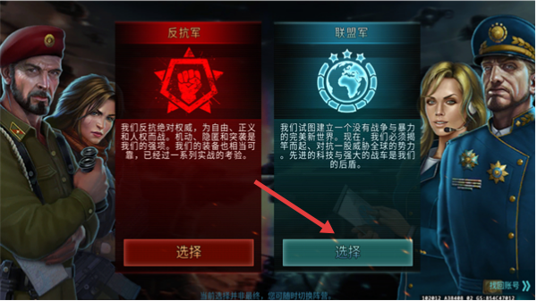 1、进入游戏先选择阵营,点击【联盟军】对应的【选择】按钮,该阵营以科技与防御为后盾,适合稳扎稳打。