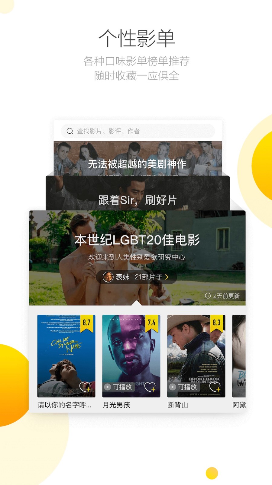4、个性影单:提供各种不同口味的影单榜单推荐,随时收藏一应俱全;