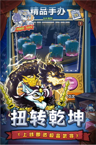 1、独创盲盒玩法:通过盲盒系统,玩家可以轻松获得稀有神装,增加游戏的可玩性和期待感。