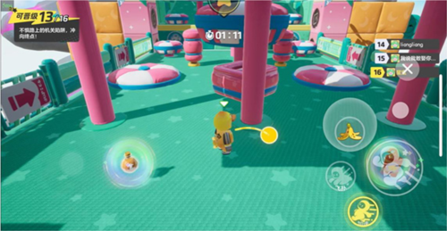 进入游戏,操作方面可以说跟蛋仔没什么差别,左边轮盘控制移动,右边分别为加速、飞扑、跳跃和道具使用。