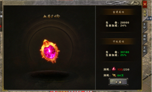 1、血符有生命和生命加成,需要消耗血符结晶和元宝进行升级
