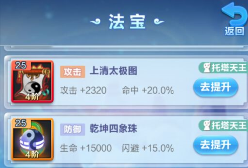 5、法宝分类:攻击法宝、防御法宝、经验法宝。