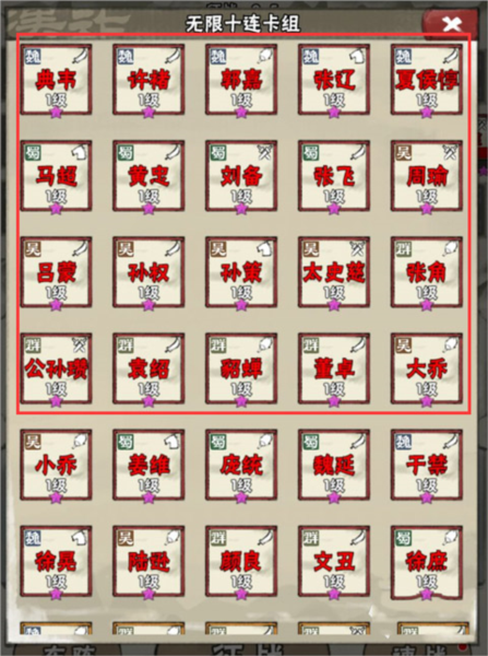 关于这个无限10连还要说明一点的是,有大约11个武将是刷不出来的,像是吕布、太史慈、关、曹、赵、华佗、貂蝉、贾诩、周瑜、诸葛亮。吕布可以从宝箱里概率获得,最新版本里还增添了保底活动,通过酒肆抽卡累计达到一定的次数必然获得。然后就是宝箱和每日充值也都可以出货,连续签到一个月送的自选包也可以出,但自选里没有曹操和吕布,这个还请注意。