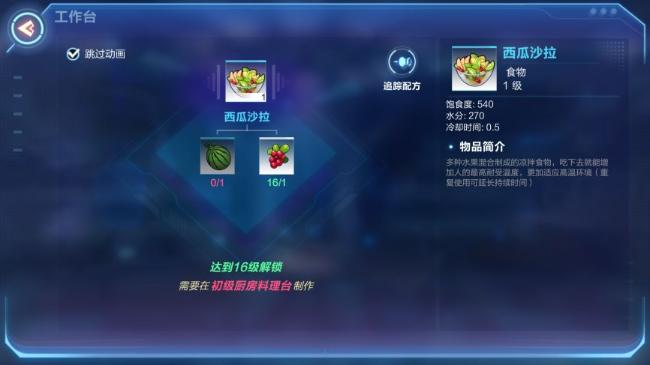 其次是西瓜沙拉,制作材料:西瓜1,红浆果1。饱食度+540,水分+270。可以有效的在炎热地带短时间抵抗炎热。
