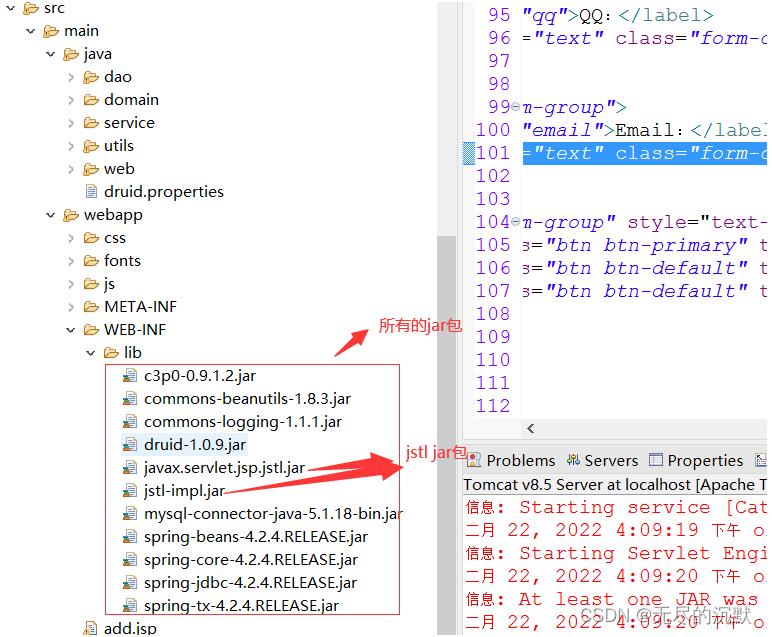 1.编写login.jsp登录页面username & password 两个输入框2.使用Druid数据库连接池技术,操作mysql,day14数据库中user表3.使用JdbcTemplate技术封装JDBC4.登录成功跳转到SuccessServlet展示:登录成功!用户名,欢迎您5.登录失败跳转到login.jsp展示:登录失败,用户名或密码错误,验证码错误