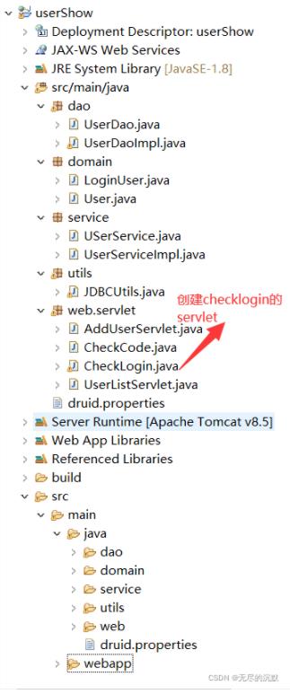 7.创建web层的checklogin的servlet,用来响应用户登录的请求。主要是进行前端参数数据和UserDao进行交互