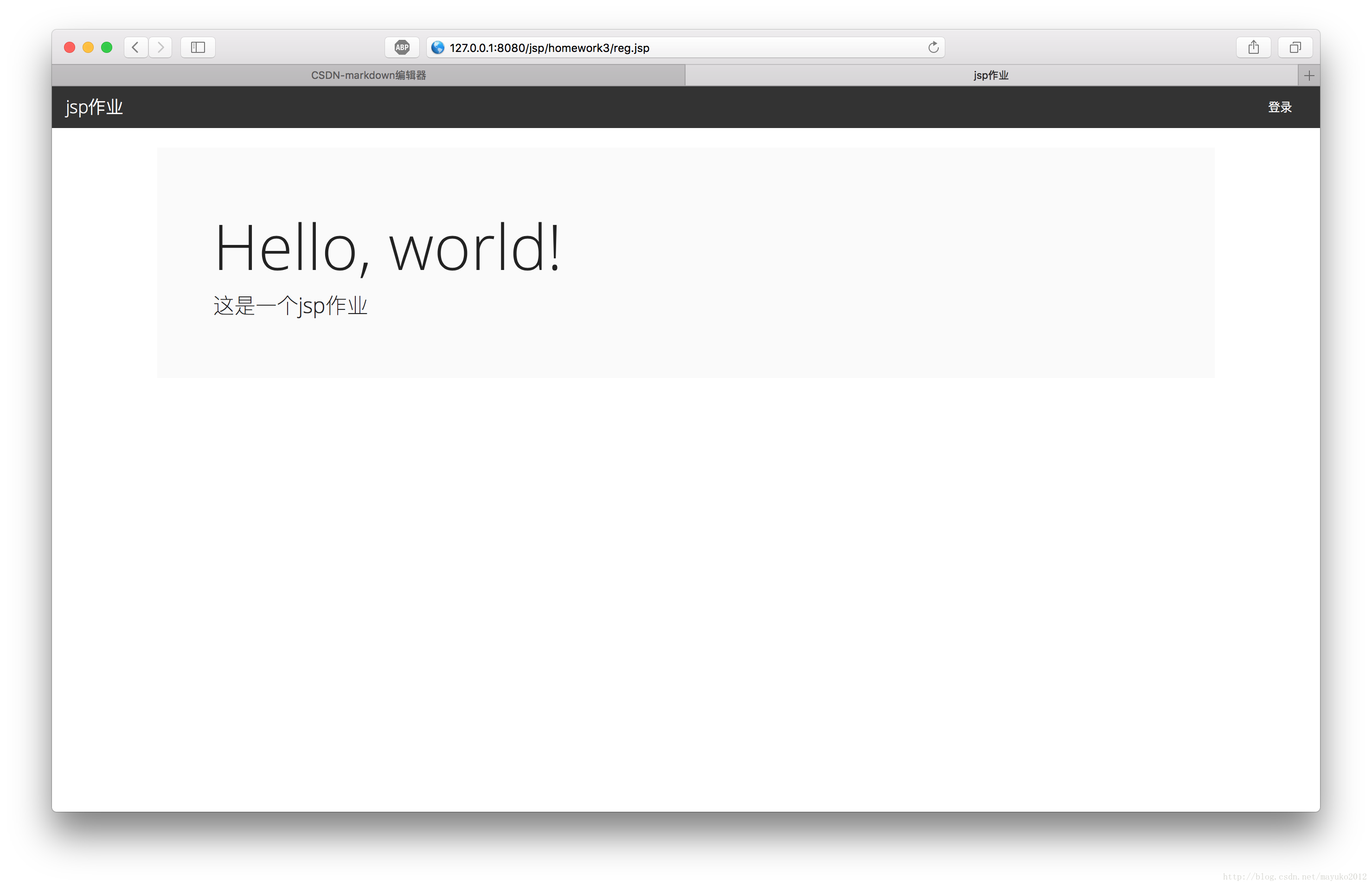 <!DOCTYPE html><html lang="zh-CN"><head> <meta charset="utf-8"> <meta http-equiv="X-UA-Compatible" content="IE=edge"> <meta name="viewport" content="width=device-width, initial-scale=1"> <title>jsp作业</title> <link href="css/bootstrap.min.css" rel="external nofollow" rel="external nofollow" rel="external nofollow" rel="external nofollow" rel="external nofollow" rel="stylesheet"></head><body><nav class="navbar navbar-default"> <div class="container-fluid"><div class="navbar-header"> <a class="navbar-brand" href="./" rel="external nofollow" rel="external nofollow" rel="external nofollow" rel="external nofollow" rel="external nofollow" >jsp作业</a></div><div class="collapse navbar-collapse" id="bs-example-navbar-collapse-1"> <ul class="nav navbar-nav navbar-right"><li><a href="login.jsp" rel="external nofollow" rel="external nofollow" rel="external nofollow" rel="external nofollow" rel="external nofollow" rel="external nofollow" >登录</a></li> </ul></div> </div></nav><div class="container"> <div class="jumbotron"><h1>Hello, world!</h1><p>这是一个jsp作业</p> </div></div></body></html>