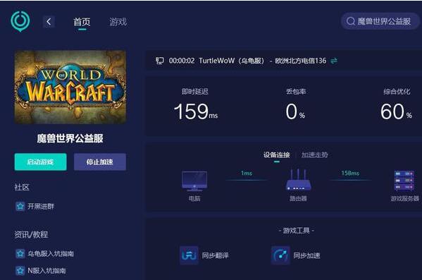 2、打开加速器后选择魔兽世界公益服加速即可。